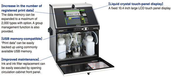 Máy in HITACHI Series được thiết kế dễ sử dụng, thân thiện với người dùng với màn hình cảm ứng 10.4 inch. Khả năng lưu trữ 150 tin cơ bản. Khả năng in phun date lên đến 6 dòng, 240 ký tự in trên 6 dòng riêng biệt và tốc độ in của 1,148 ký tự trên mỗi giây, lưu trữ 300 bản tin, (Option lên đến 2000 tùy thuộc vào dữ liệu). Màn hình: Cảm ứng Ngôn ngữ: Tiếng Anh – Tiếng Việt Bề Mặt in: Nhựa, giấy, gỗ, đá, xi măng, thủy tinh, kim loại, kính,….v..v Ký tự in: Chữ cái abc, qr code, barcode...